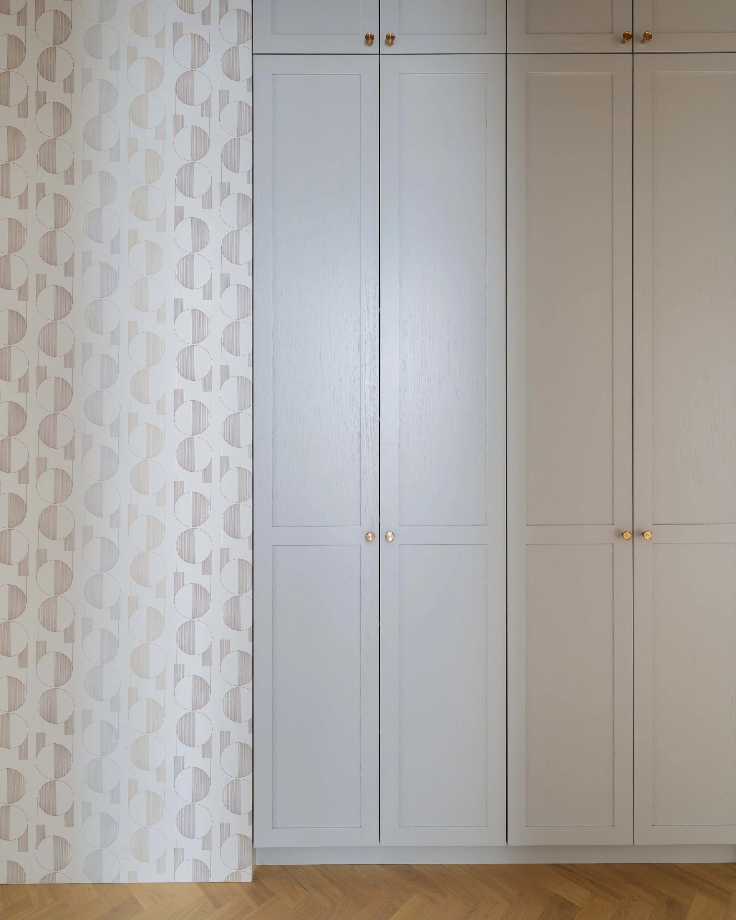 Højskabe med malede shakerfronter. Naturlig eg indvendigt.