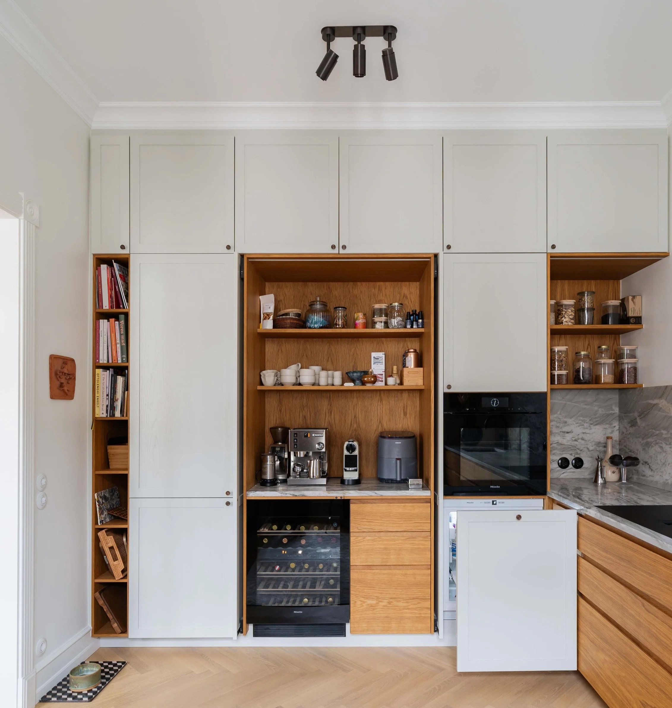 Højskabe fra gulv til loft, med pocketskab i midten.