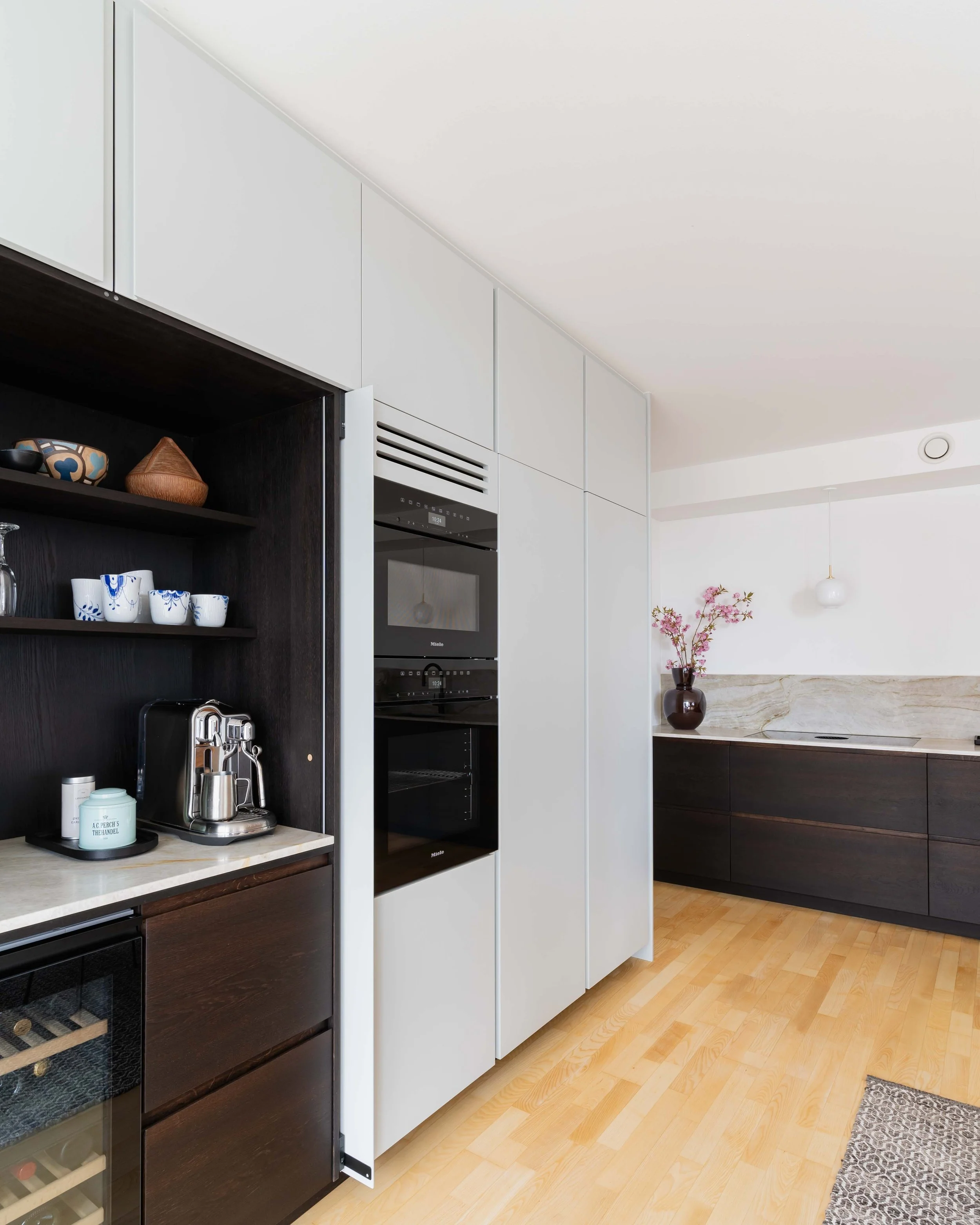 Stort pocket-skab med kig til vin køleskab og kaffe niche.