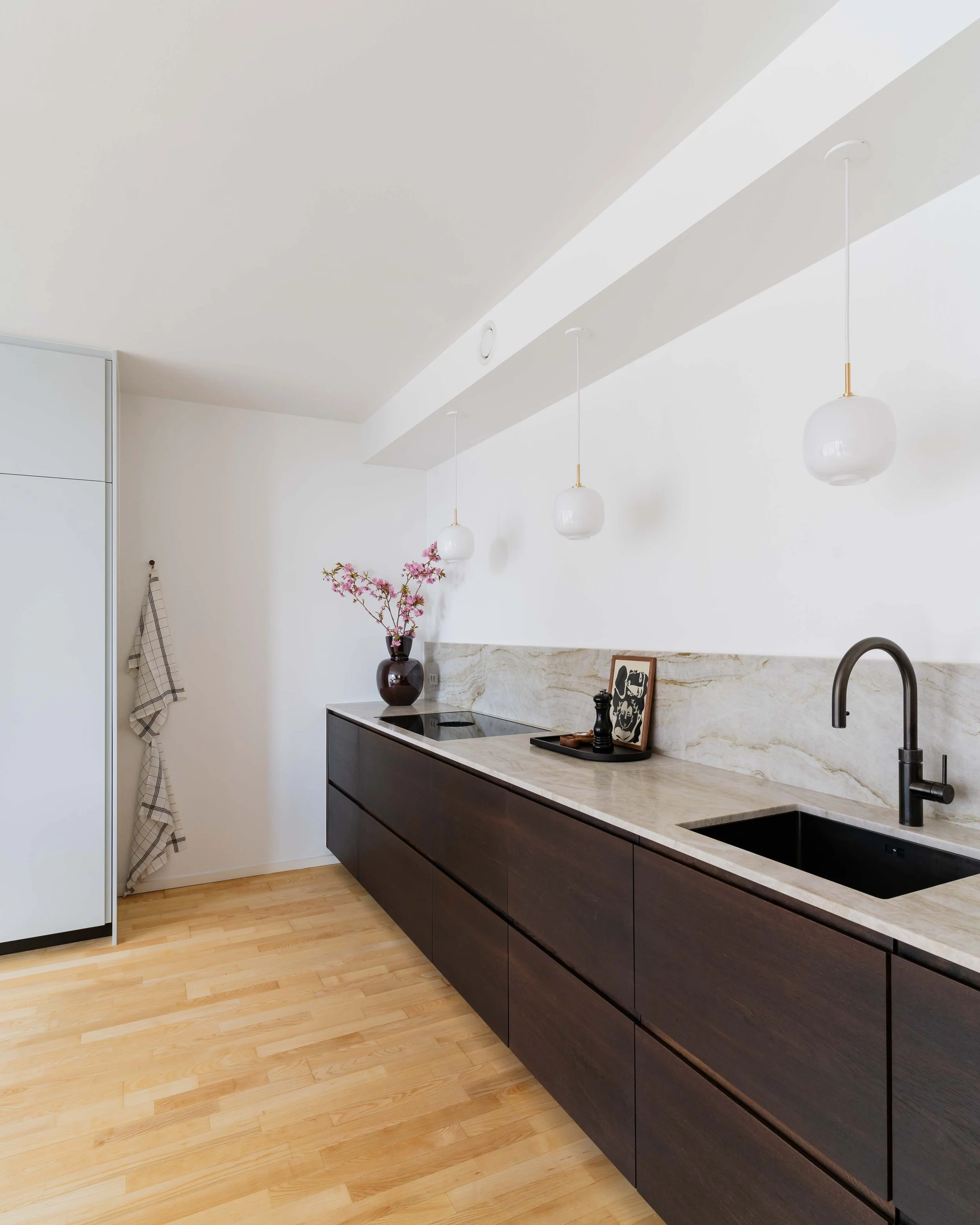 Højskabe og skuffer med fræst greb. Bordplade og back-splash i Quartzite. Kogetop fra BORA. Quooker og vask i gunmetal.