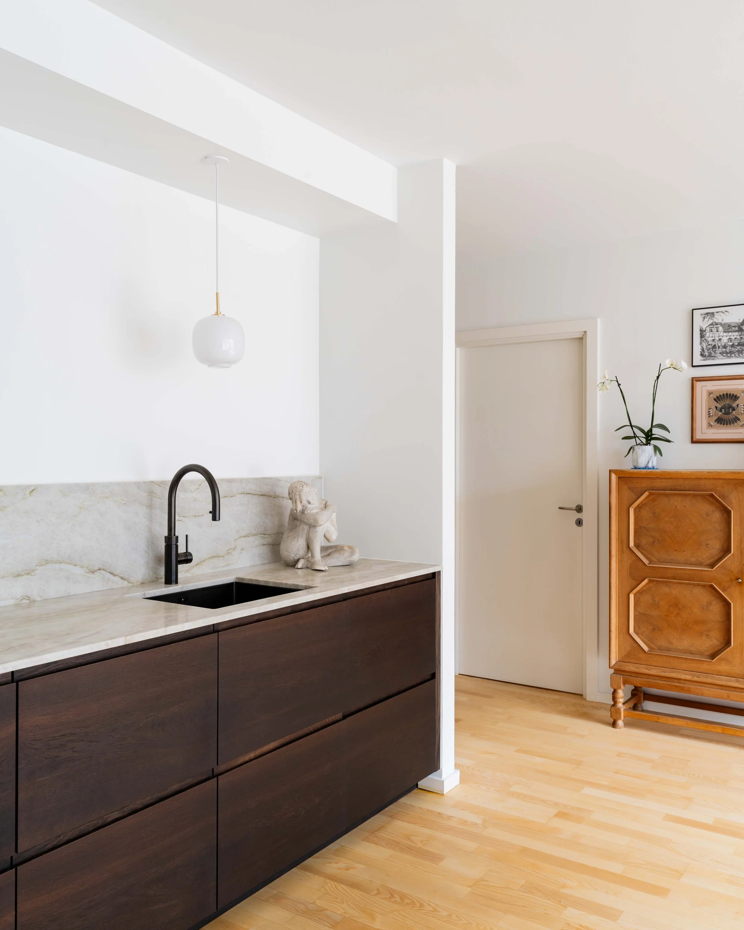 Snedkerkøkken i en kombination af mørk røget egetræ og malede fronter på højskabet.
